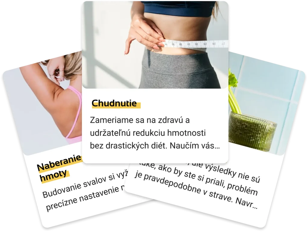 Moje portfólio služieb pokrýva celé spektrum vašich potrieb – od efektívnej redukcie hmotnosti a formovania postavy až po cielený rozvoj svalovej hmoty a zvýšenie športového výkonu. Spoločne nájdeme riešenie ušité na mieru vášmu životnému štýlu, ktoré vám prinesie nielen viditeľné výsledky, ale predovšetkým pevnejšie zdravie a viac energie do každého dňa.